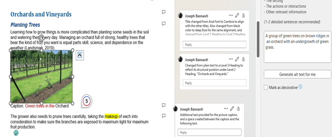 The text color, headings in the simulation, alternative text, lack of spacing between paragraphs, insufficient picture captions, and lack of captions in some images are some of the accessibility issues in which the document is deficient. To make the document accessible, the red text color was changed to blue, headings in the simulation were given their logical position in the document structure, making sure there were no skipped level headings, alternative text was introduced into the document, and spacing was created between paragraphs. Insufficient (single-word) image captions were made more explicit by adding a few descriptors. There were no captions in some cases, so they were added to the images. In most cases, the accessibility mechanisms were available in Word- whether to change text color, add Alt text, add comments, or change Headings or font type and color. It was a matter of using WebAim for guidance to identify the proper process.