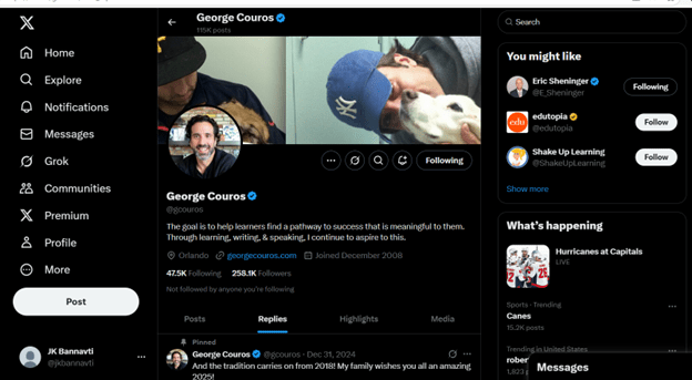 The infographic is the profile page of George Couros, the educator, public speaker, writer, and leadership expert. It features pictures of George and his pet dog, accompanied by lines that capture the goal of the blog: “The goal is to help learners find a pathway to success that is meaningful to them. Through learning, writing, & speaking, I continue to aspire to this.” You can search, comment, tweet, retweet, respond, and follow on the page. Suggestions for you to follow are displayed on the right side of the screen, and a list of menus is located on the left.