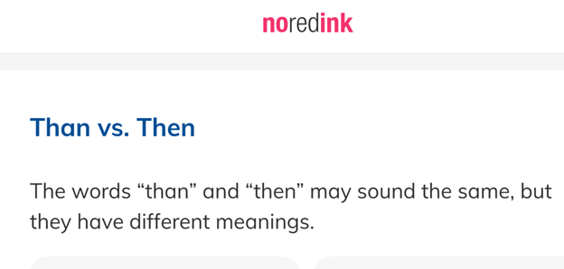 NoRedInk is designed to cater to English Language Arts and Social Studies curricula. Once the teacher logs on to Assignment Library and chooses Skills Building, the teacher will select the lesson on Homophones or sound-alike words. A brief lesson objective is provided with specific homophones, which will be analyzed. A 5-20 minute Tutorial is also provided.