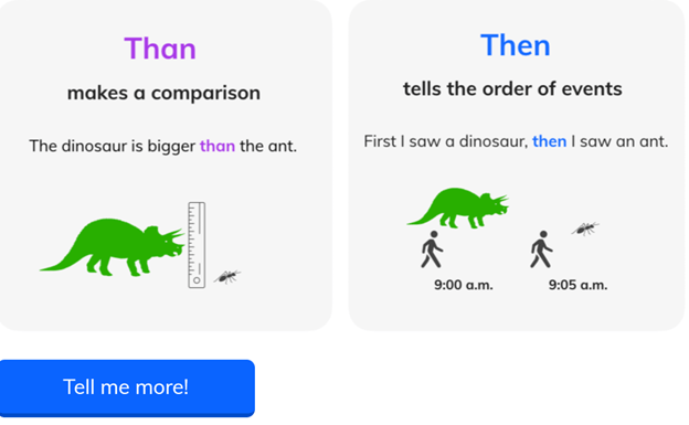 These are inbuilt capabilities that are automatically designed for the students as they access the lesson. A tutorial requires two mouse clicks to guide the lesson in terms of clicking the correct answer. The tutorial drills down into each homophone a student selects and leads them to the underlying differences between the words from meaning to structure.