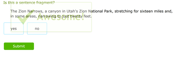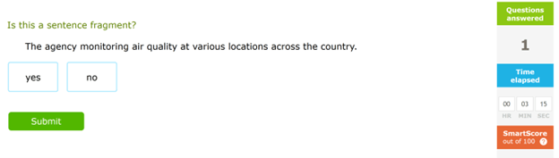 Under the section, Grammar and Mechanics and the topic, Sentences, Fragments, and Run-ons, the assignment requires the student to identify the sentence fragment from the choices displayed. Only one sample sentence is shown for each question, and the user is asked to determine whether it is a fragment by clicking Yes or No. When either Yes or No is selected, the submit button comes alive and can be clicked on to submit the response.